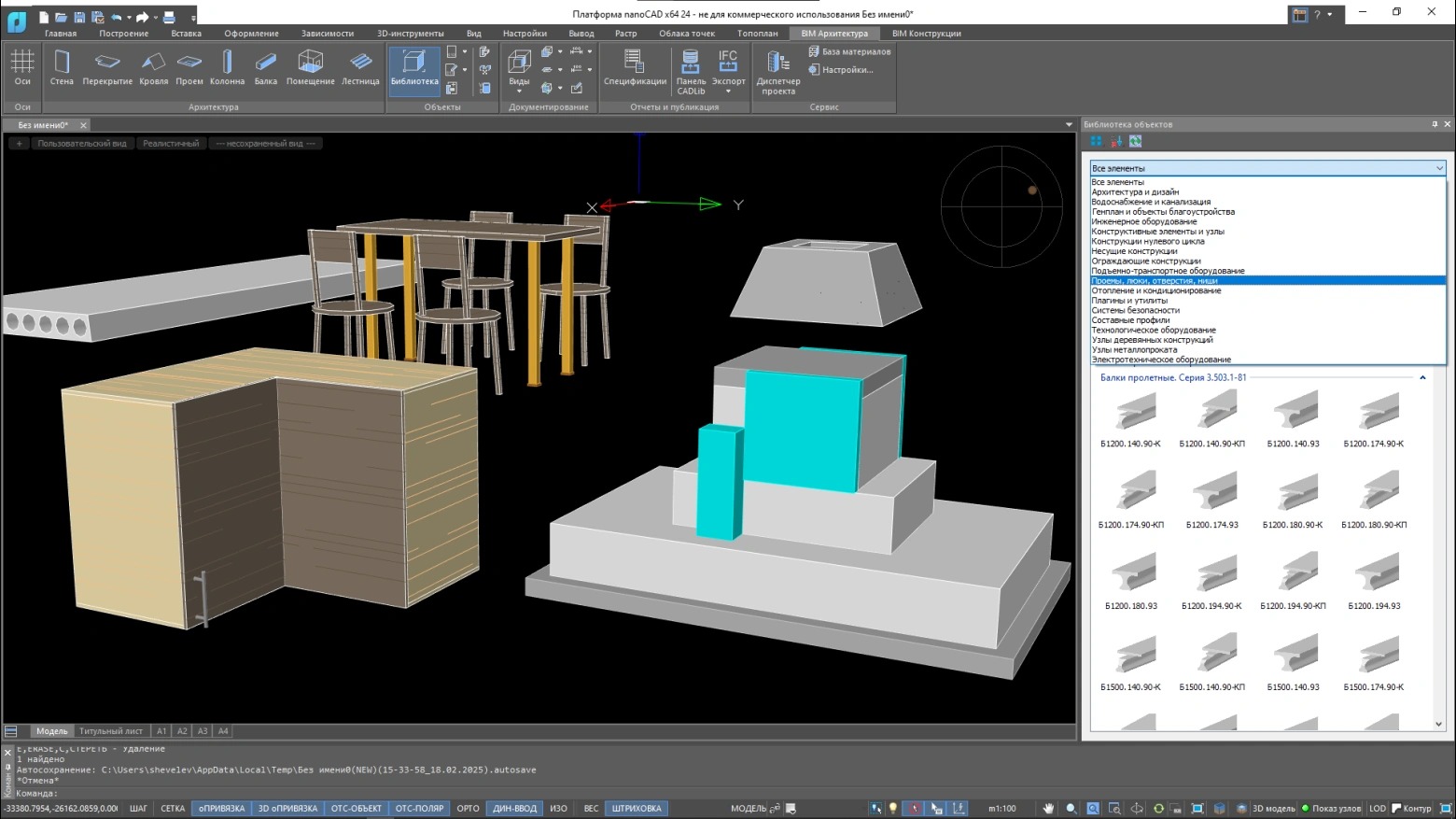 nanoCAD BIM Строительство объединяет работу над архитектурной и конструктивной частью:- Инструменты для объемно-планировочных решений, проработки помещений, конструктивных элементов.
