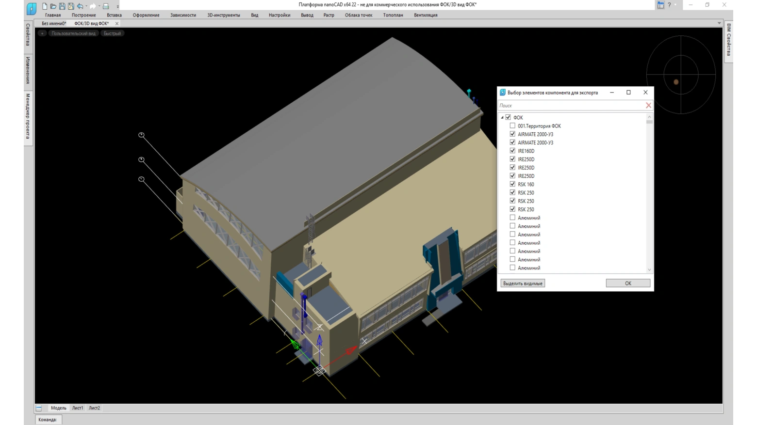 Поддержка экспорта в обменный .ifc-формат позволяет легко встраивать информационные модели вентиляционной системы, выполненные средствами программы nanoCAD BIM Вентиляция, в сводную модель проектируемого объекта, реализованную на любой САПР/BIM- платформе
