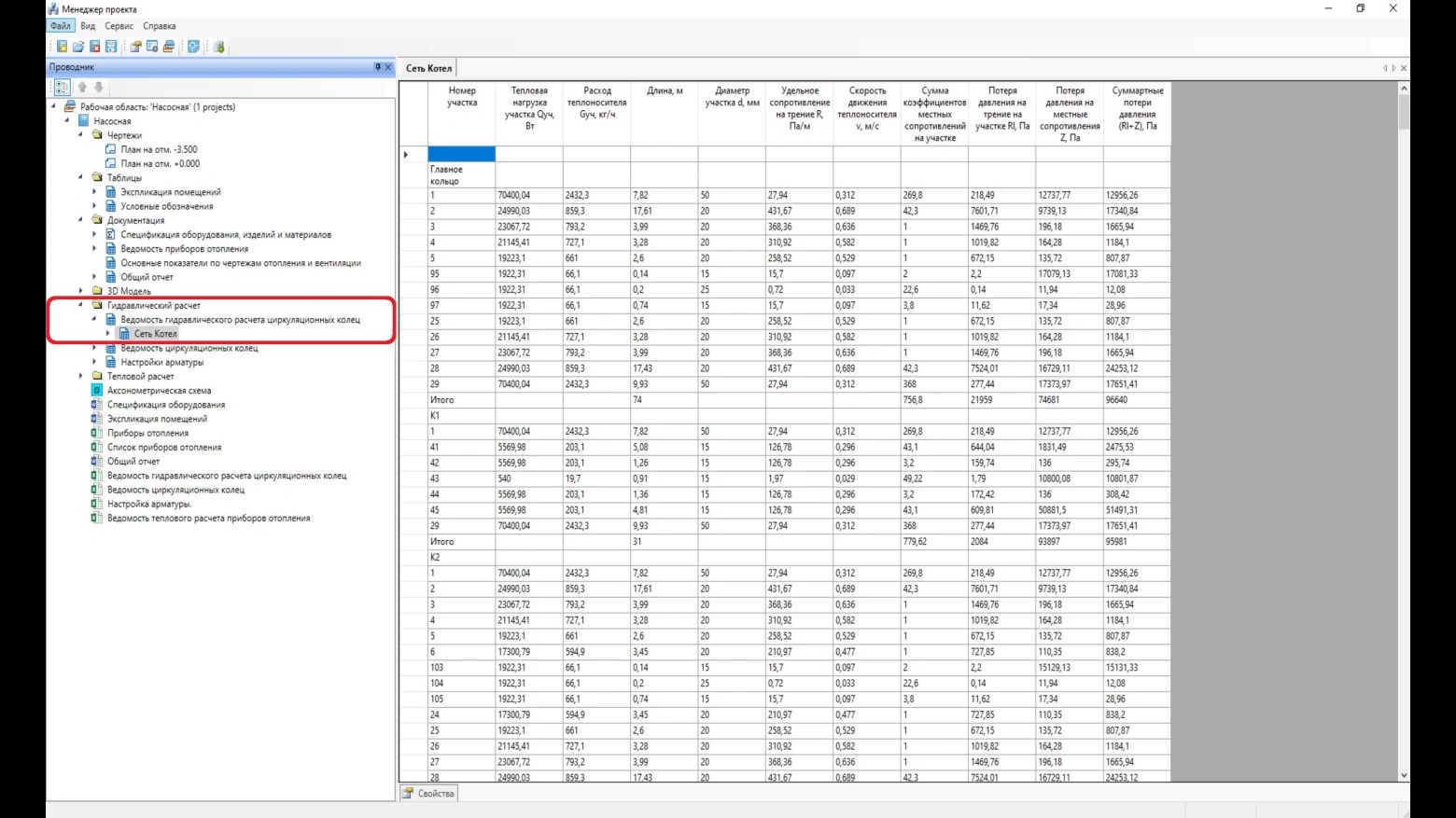 При выполнении расчета программа просчитывает трехмерную модель системы, вычисляет скорости движения, потери давления в трубах и на местных сопротивлениях. По результатам этих расчетов осуществляется подбор арматуры, приборов, диаметра труб и формируется отчет по каждой системе