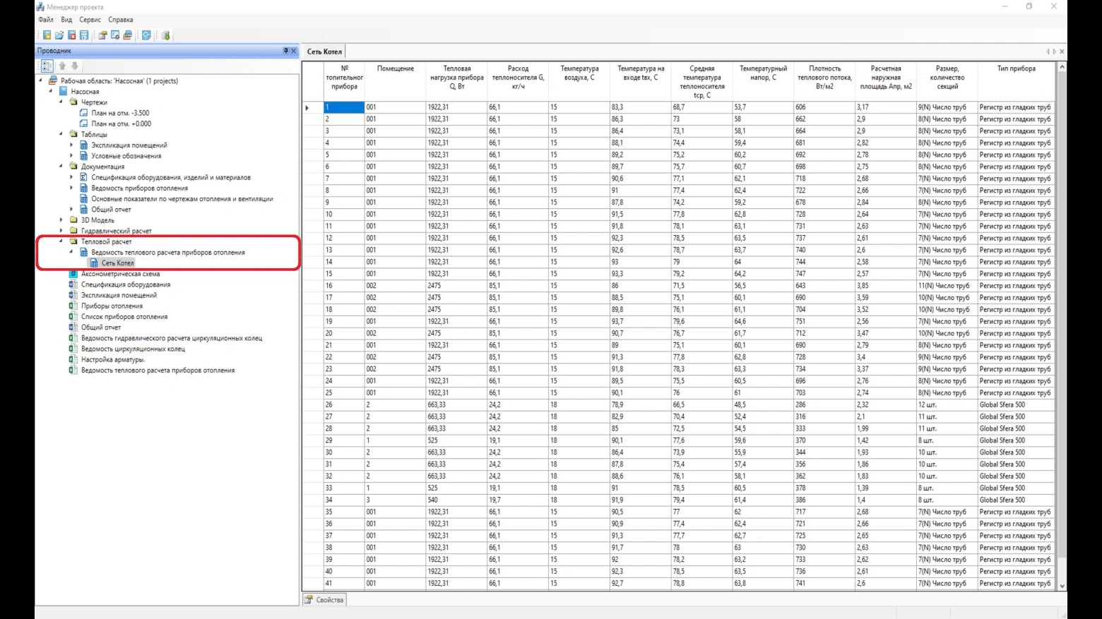 При выполнении расчета программа анализирует параметры каждого участка сети. На участках производится расчет тепловой нагрузки, расхода теплоносителя. По результатам расчета осуществляется подбор числа секций радиаторов и формируется тепловой отчет по каждой системе