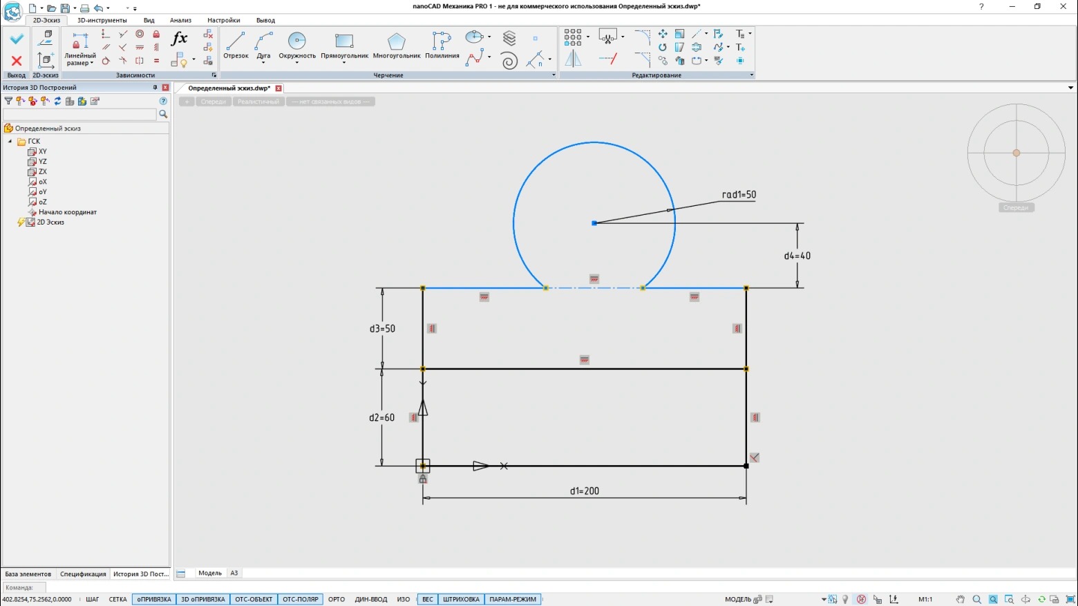 Цветовая индикация для полностью определенных и свободных элементов в эскизе упрощает процесс визуального анализа и дополнения геометрии